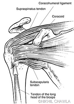 With shoulder arthroscopy, the surgeon makes several small incisions around the shoulder. A small camera and instruments are inserted through the incisions. These instruments are used to cut through the tight portions of the joint capsule.